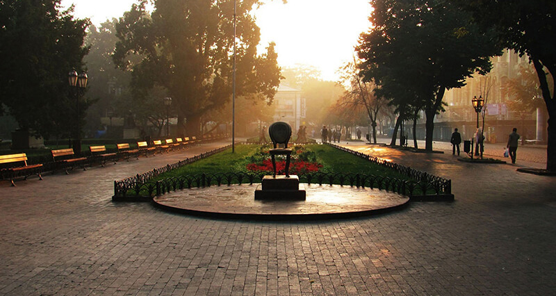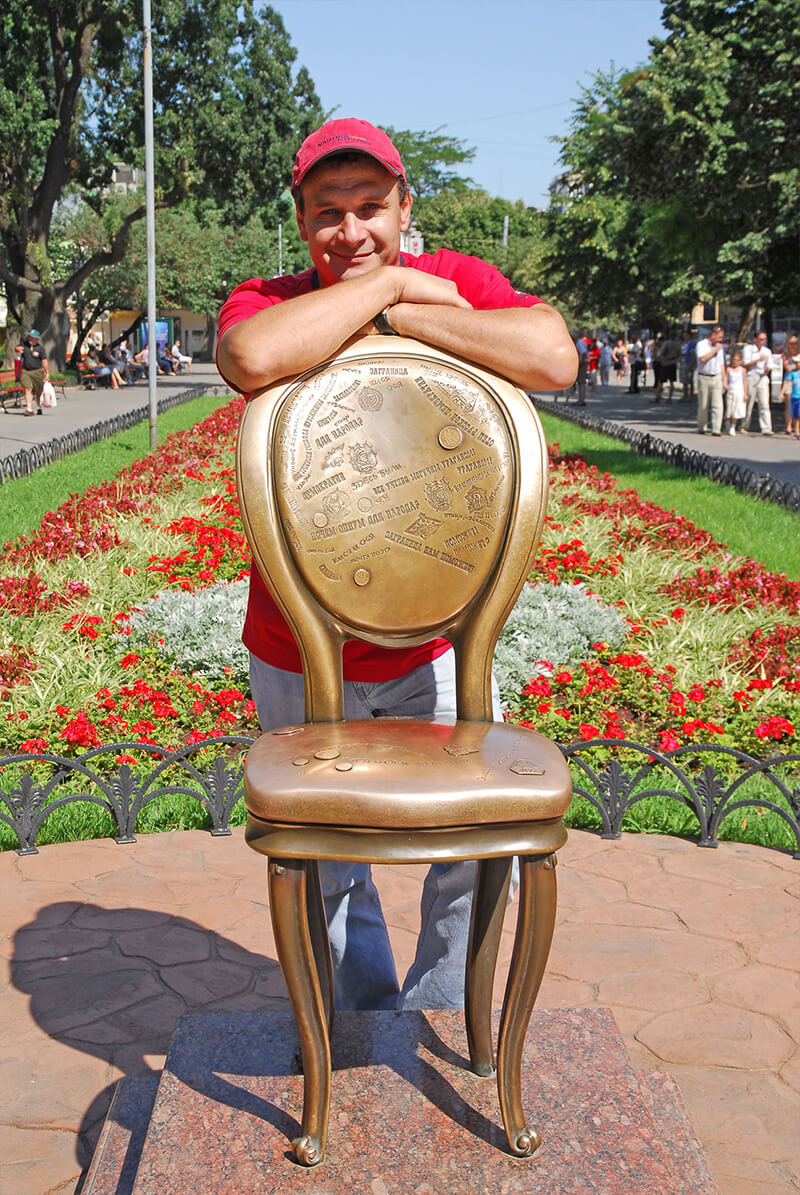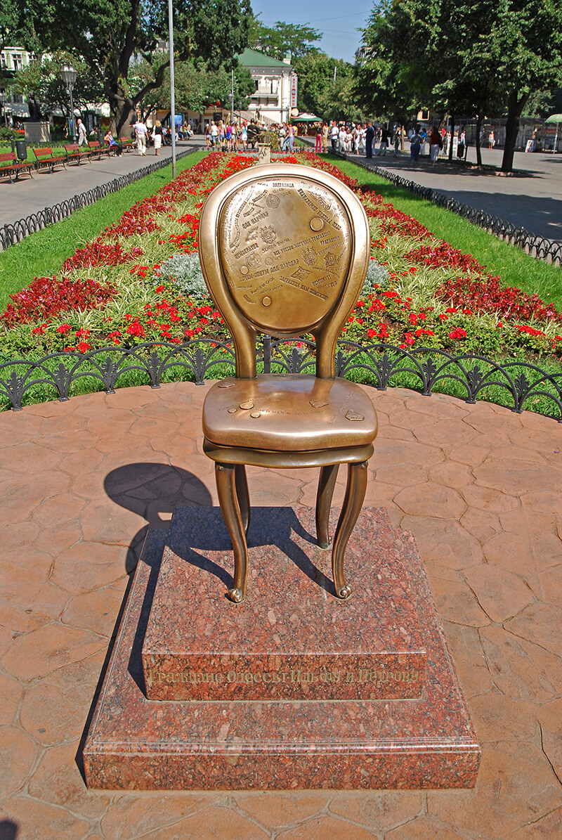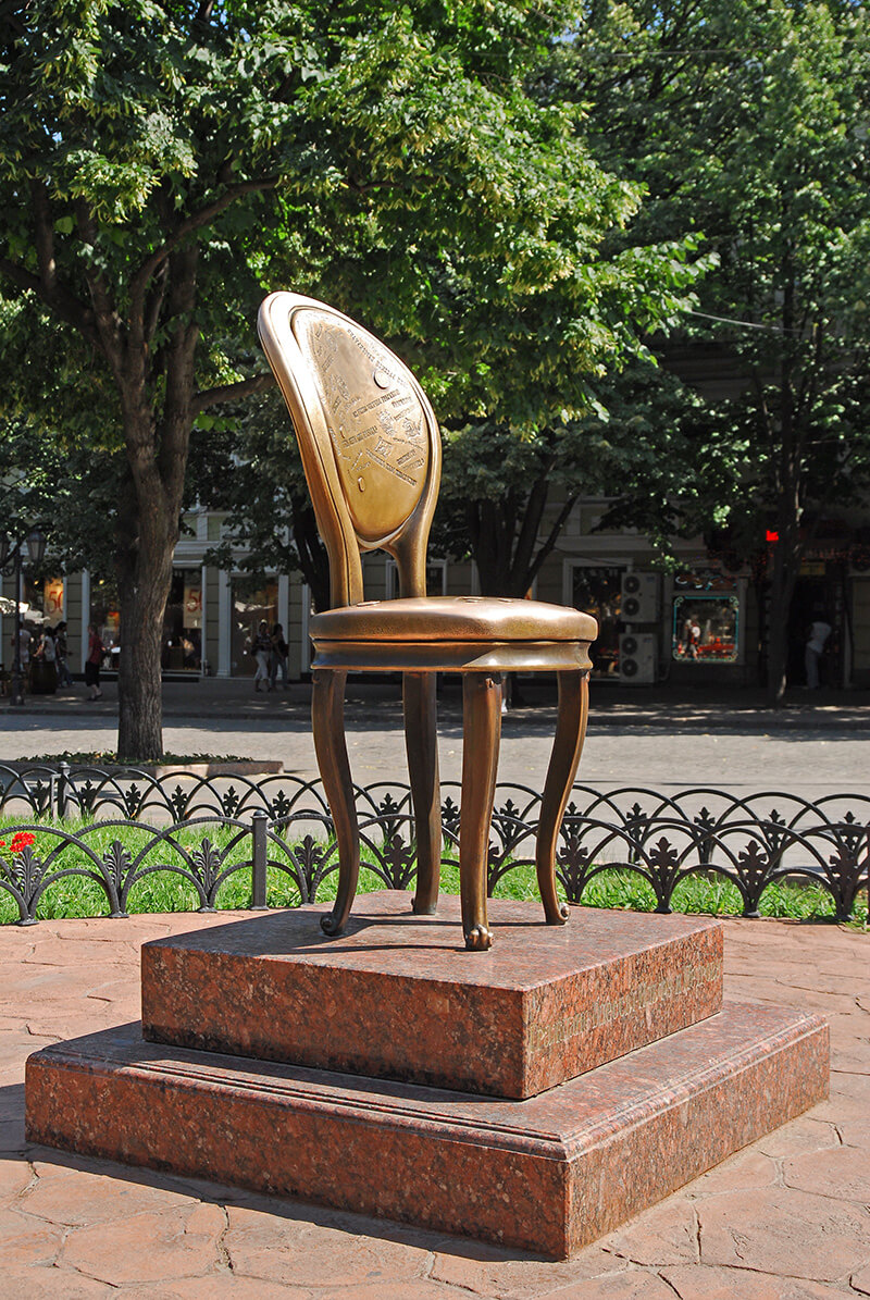 "Monument to the Chair'' is a tribute to creativity of Odessa's outstanding writers Ilf and Petrov. On a plot of their legendary novel, the heroes are chasing a scattered set of 12 chairs, one of which contains a different treasure: my jewels are the famous phrases from the novel, which are engraved on the back of the chair along with images of lapel ping and coins of that time. But the most important peculiarity of this sculpture is its provocative nature. It invites viewers to the endless game with he sculpture, a kind of a performance of relations.